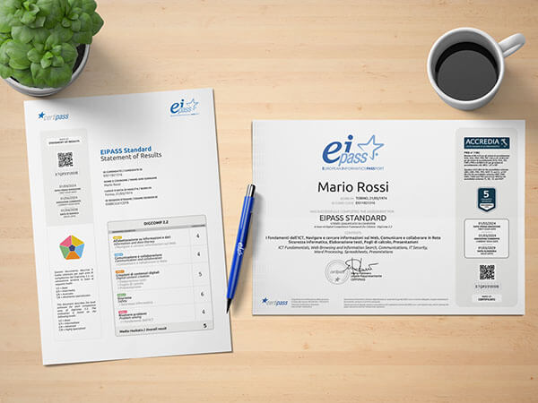 La certificazione EIPASS Standard è in linea con le 5 Aree di competenza del DigComp 2.2. L’attestato di certificazione è composto da due parti: